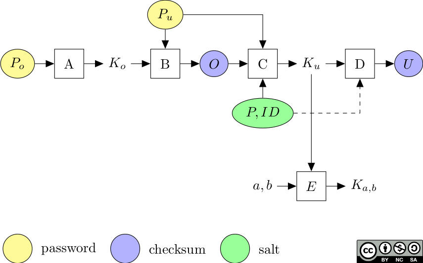 Given the user password , the owner password , the permission flags and the document , some ad-hoc algorithms allow to compute encryption keys and to verify the checksum values and . I describe these algorithms to in the following sections. The following figure summarizes the flow of inputs and outputs between them.