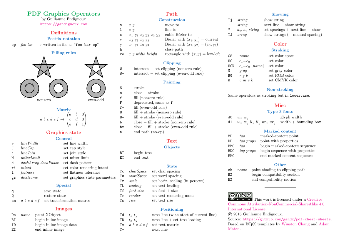 As I explained, graphical instructions a stored in content streams. These instructions are quite simple and allow to construct paths, choose colors and related attributes, draw text, etc. I made a one-page cheat-sheet to summarize these instructions, available on GitHub. As you can see, most graphical instructions take a fixed number of arguments of well-defined basic types (number, string, name…).