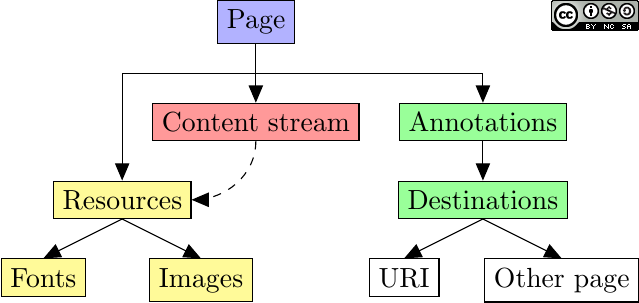 As we will see, content streams contain only basic instructions, so they often refer to external resources such as images or fonts. These resources are provided by the page. Also, it is important to note that graphical content is separated from interactive content, such as hypertext links. The following figure shows the hierarchy of objects related to a page.