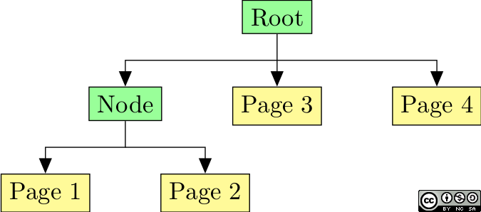 However, contrary to one would expect, this list of pages is not stored as an array of references. Instead, they form a tree called the page tree, of which the leaves are page objects. Leaves are naturally ordered from left to right, as shown below.