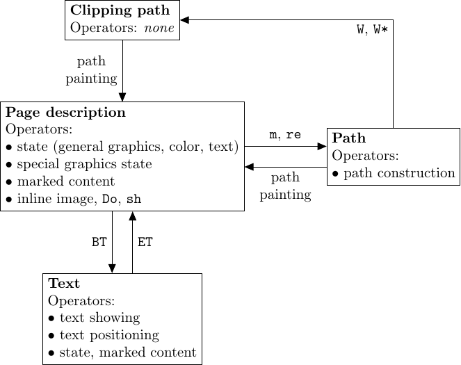 Graphical instructions can be divided into several categories: setting of graphical parameters (line width, dash pattern, colors, font…), path construction, path painting, text showing, and misc instructions (image drawing, marked content…). Most instructions can only appear in a specific context. For example, a path painting operator must be immediately preceded by path construction operator(s).