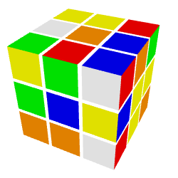 It turns out that the physical structure of the cube gives more constraints: corners can only be permuted with corners, sides can only be permuted with sides, and centers can only be permuted with centers. What’s more, the 3 squares that form a corner are bound together, and same goes for the 2 squares that form a side. Finally, given 3 colors (e.g. white, red, blue), there is at most one corner that combines these colors. Same goes for sides.